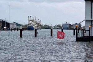 Overstroming in de haven van Oudeschild: water op de kade